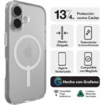 La funda Crystal Palace Snap con soporte combina elegancia, funcionalidad y resistencia, con tecnologías anti-amarillamiento y anti-rayaduras para mantener su belleza. Su diseño fluido tiene un agarre texturizado y un soporte para colocar el teléfono en vertical y horizontal. Ofrece protección contra caídas de hasta 4 metros gracias a su refuerzo con grafeno, uno de los materiales más fuertes del mundo, destacando y protegiendo tu iPhone.